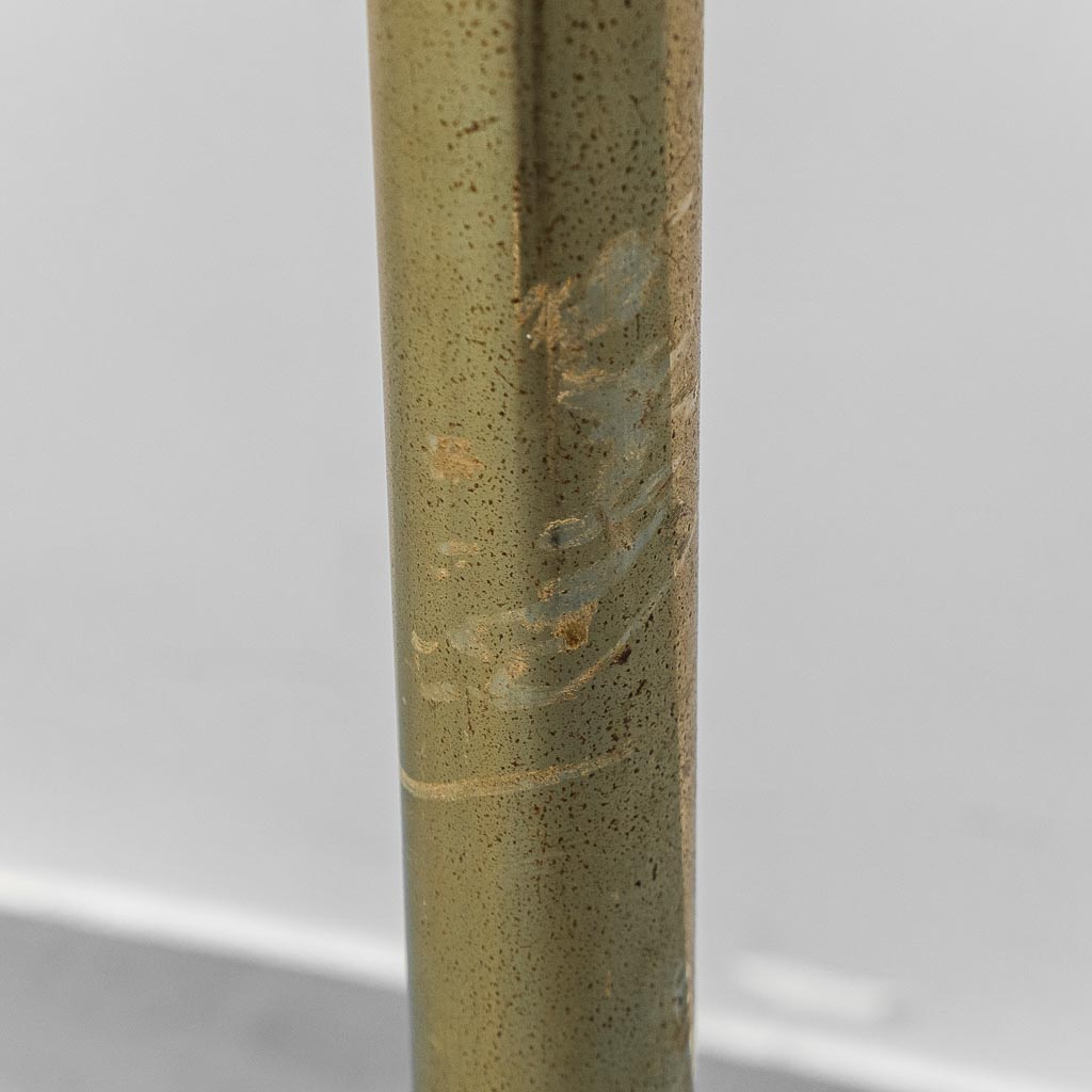 Raffinato appendiabiti da terra vintage caratterizzato da una struttura slanciata in ottone con elementi terminali sferici e da una solida base in marmo che ne garantisce stabilità ed eleganza.
