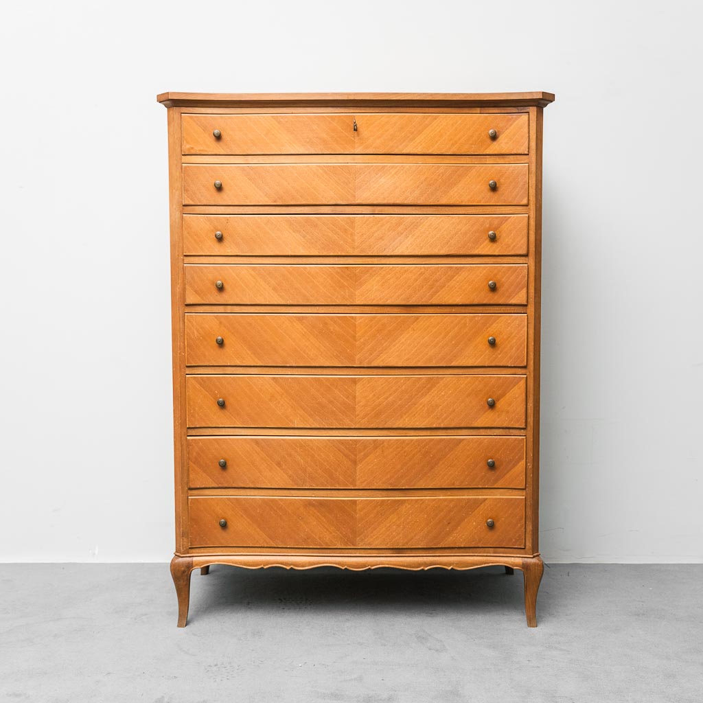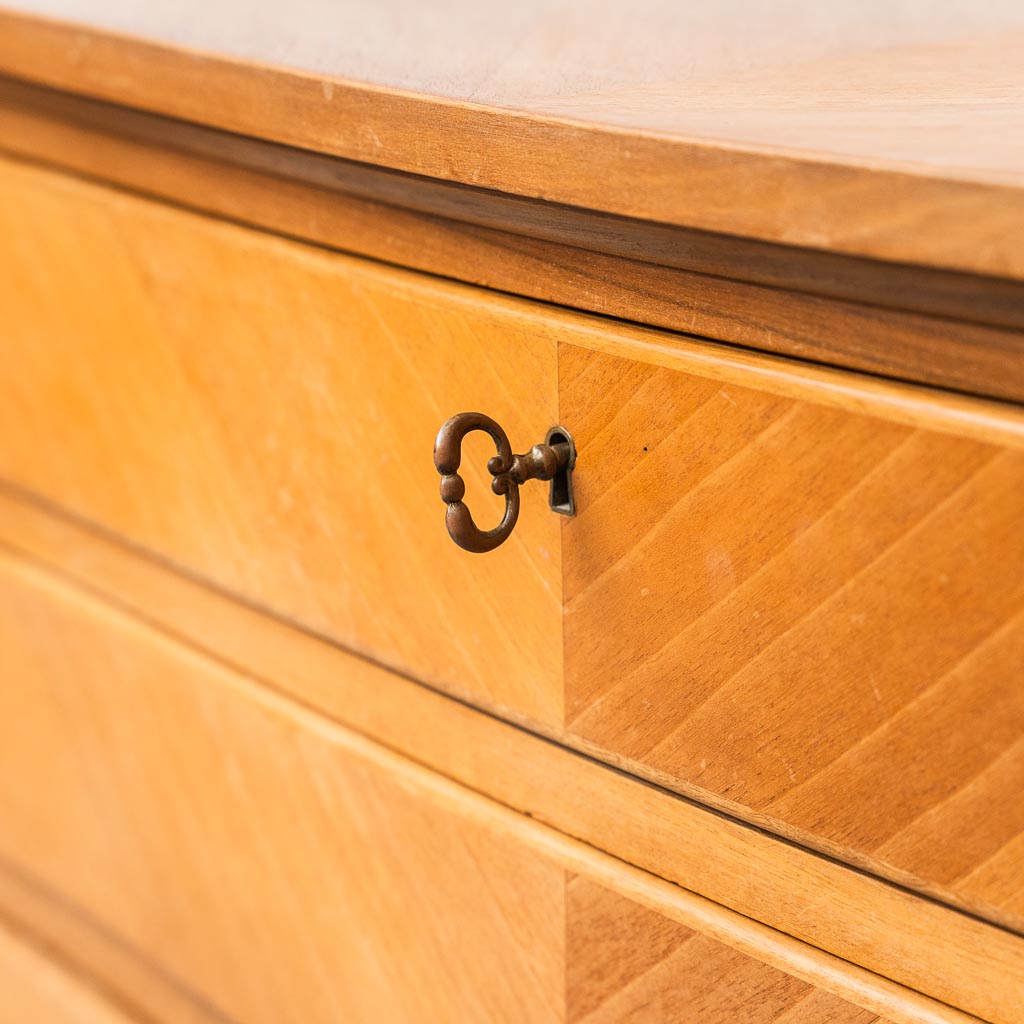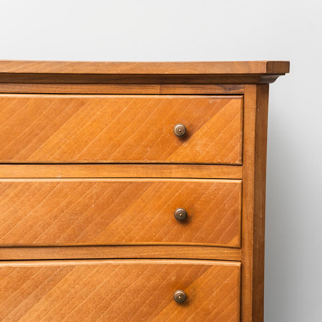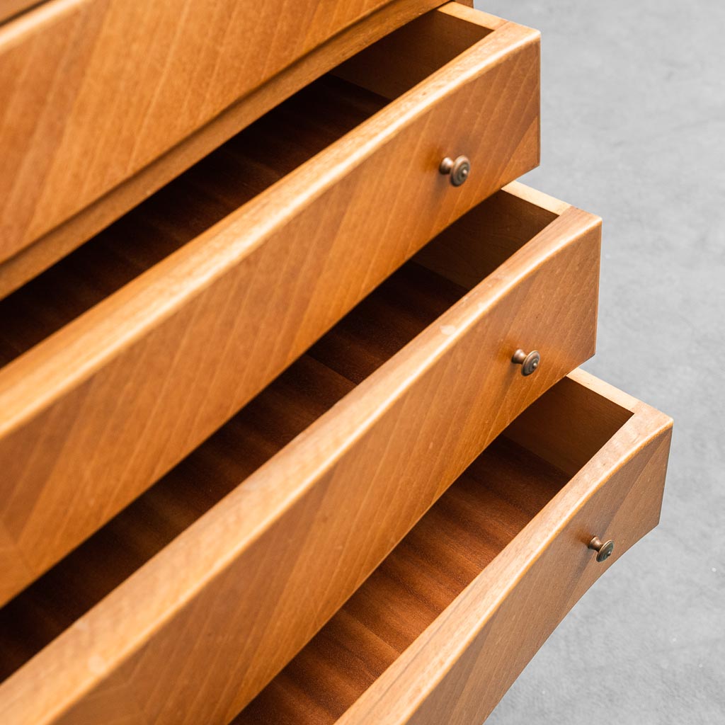 Il mobile presenta una struttura slanciata con sette cassetti frontali, decorati con una pregiata impiallacciatura a spina di pesce, che conferisce dinamismo e simmetria visiva alla superficie. Le maniglie tonde in ottone brunito aggiungono un tocco discreto e sofisticato.