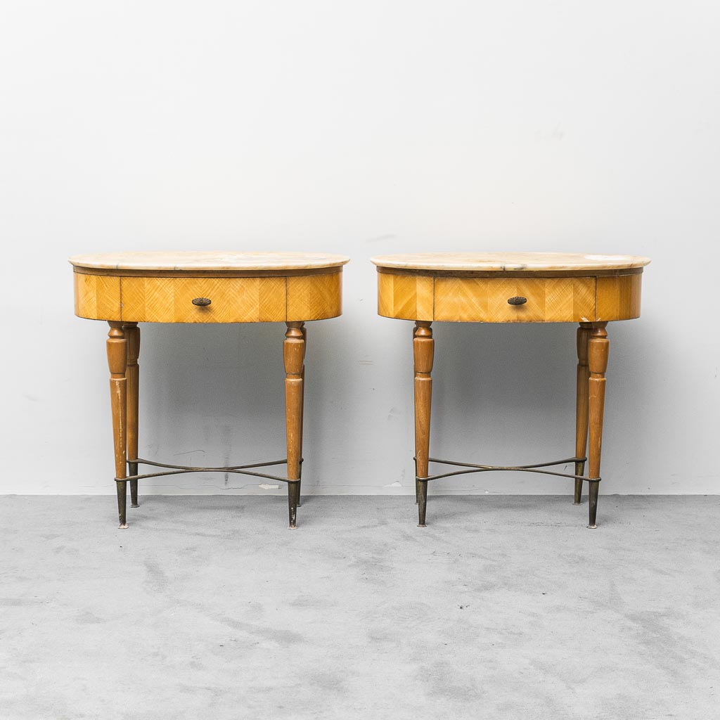 Elegante coppia di comodini vintage caratterizzati da piani ovali in marmo chiaro e struttura in legno con lavorazione impiallacciata a spina, sostenuta da gambe slanciate con puntali in ottone.