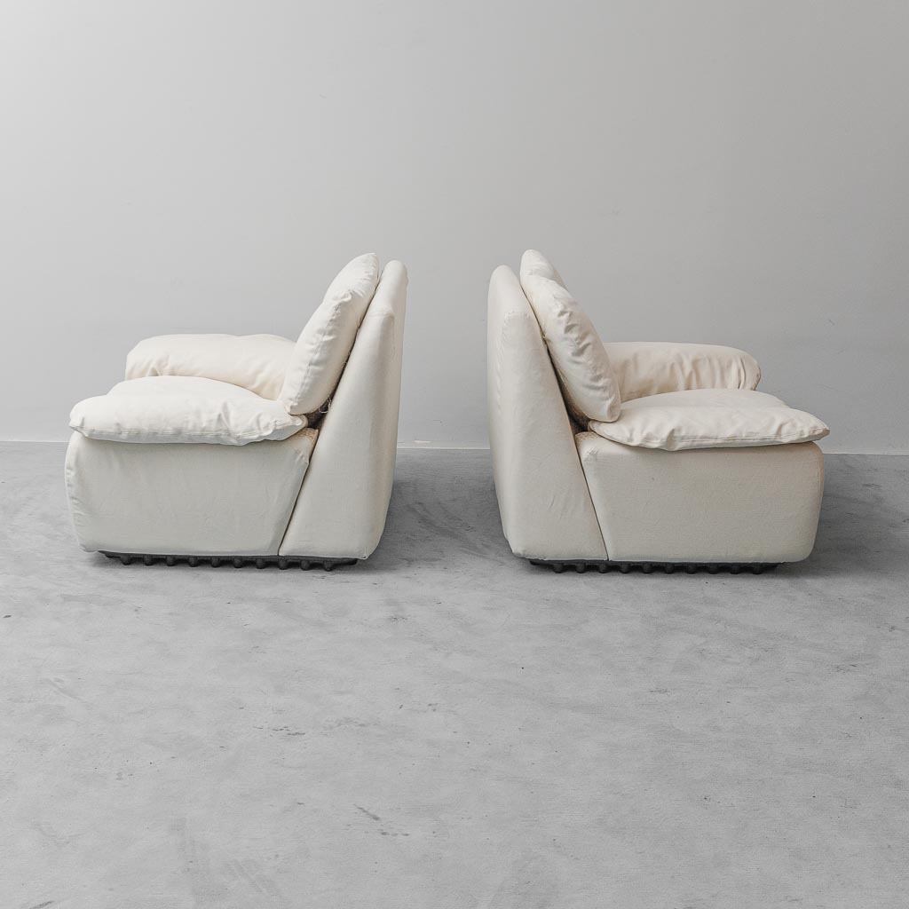 Originale coppia di poltrone Rezia disegnate da Emilio Guarnacci per 1P, esempio rappresentativo del design italiano anni ’70. Le sedute presentano forme morbide e avvolgenti con imbottitura generosa, pensate per offrire comfort e uno stile lounge tipico del modernariato italiano. Ideali per soggiorno, studio o ambienti dal gusto Mid-Century e vintage.