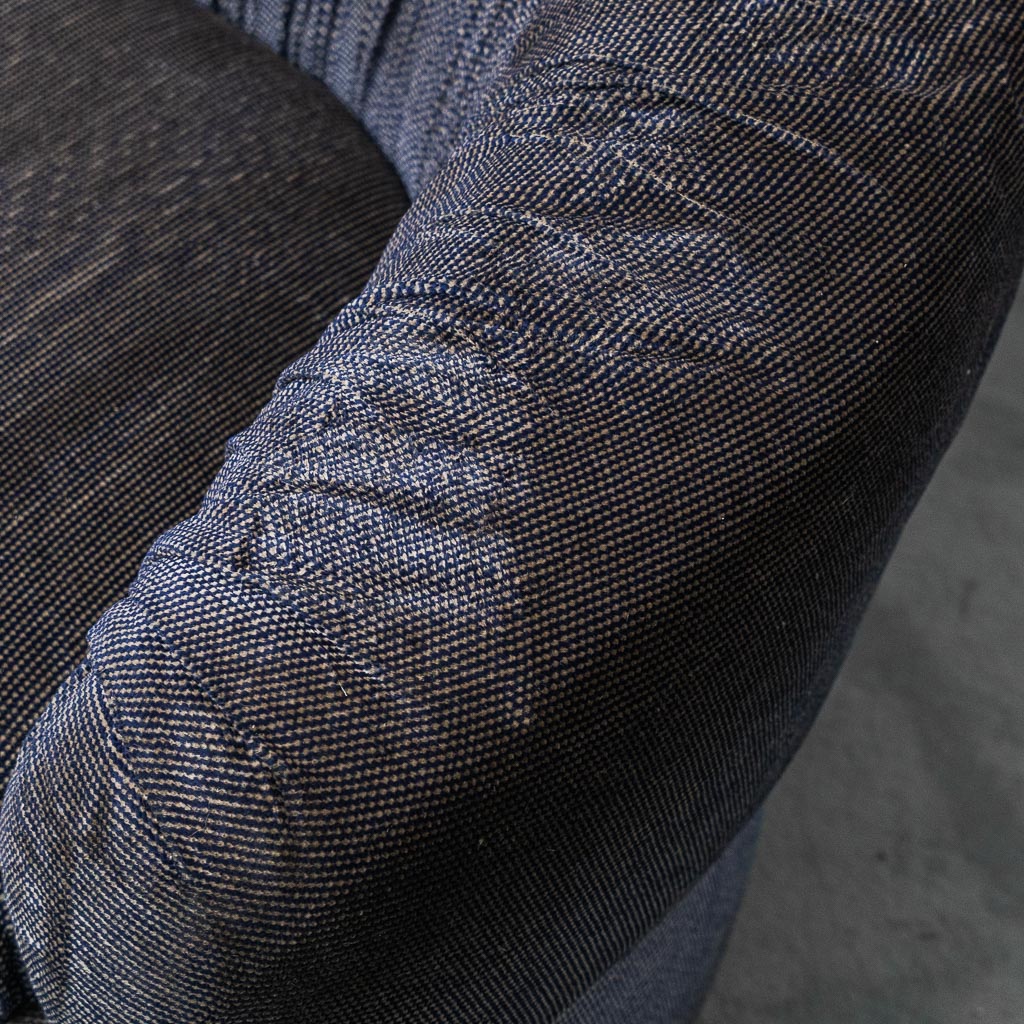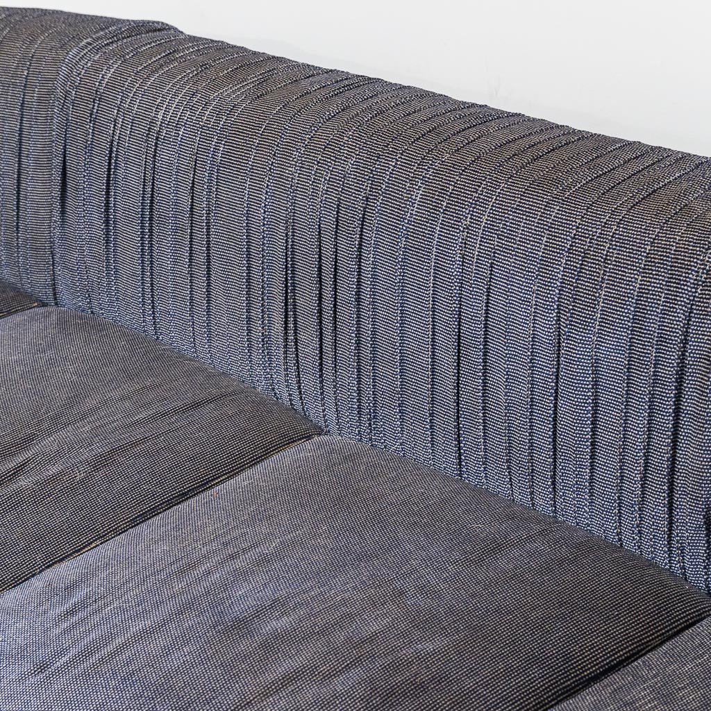 Il rivestimento in tessuto blu con lavorazione verticale valorizza le forme del divano, rendendolo ideale per living contemporanei, loft, spazi creativi o ambienti contract. La modularità consente una certa flessibilità nella disposizione, mantenendo un forte impatto visivo.