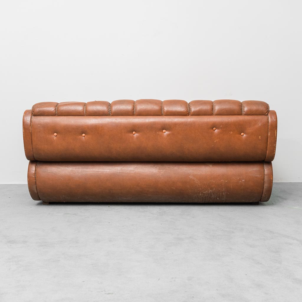 Affascinante divano vintage a 3 posti in pelle, caratterizzato da una silhouette morbida e accogliente, tipica della produzione tra gli anni ’70 e ’80. La pelle color marrone caldo, con la sua naturale patina del tempo, dona al divano un aspetto vissuto ed estremamente autentico, valorizzando ogni segno come parte della sua storia.