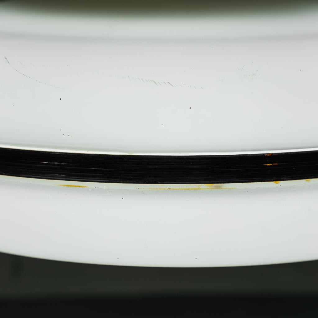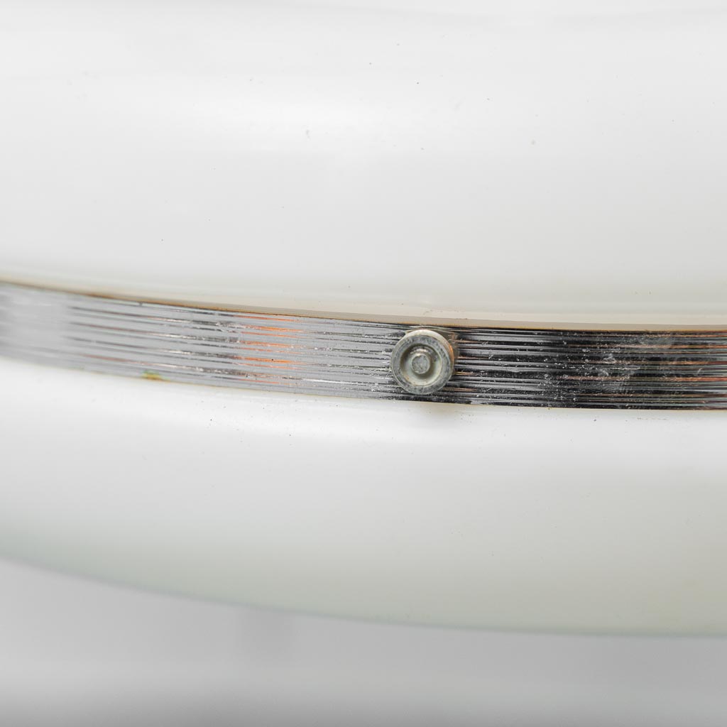 Il corpo principale è composto da un diffusore circolare in metallo smaltato e plastica, con una banda centrale trasparente che permette alla luce di filtrare creando un’illuminazione avvolgente e uniforme. Il dettaglio inferiore in metallo aggiunge equilibrio alla forma e un tocco tecnico tipico del design Space Age.