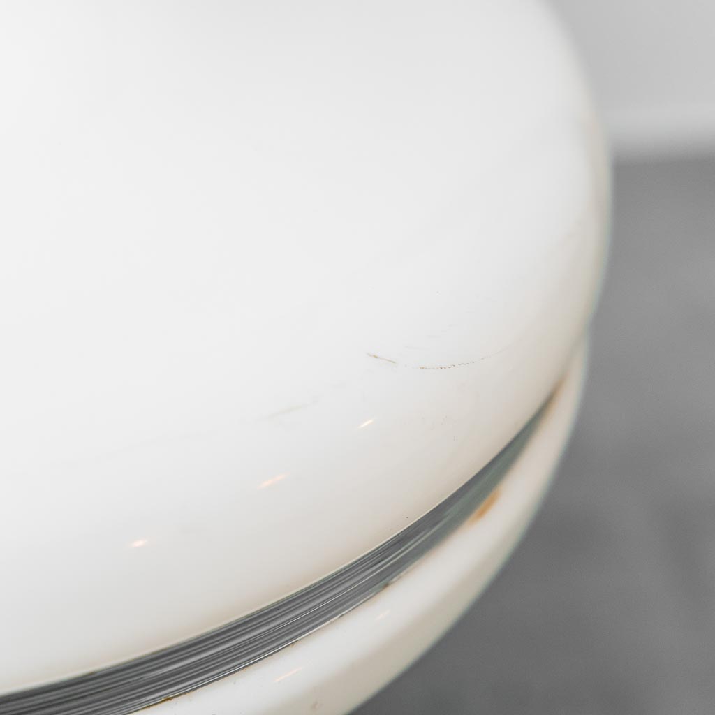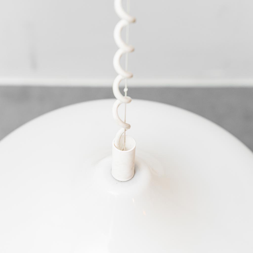 Questo lampadario Space Age anni ’70 rappresenta perfettamente l’estetica futuristica che ha segnato il design di quel decennio. Le sue linee morbide e aerodinamiche richiamano le forme delle capsule spaziali, mentre la finitura bianca lucida dona un carattere luminoso, pulito e iconico.