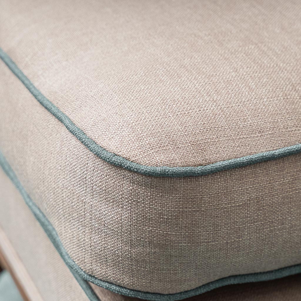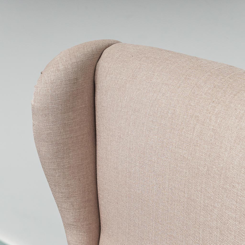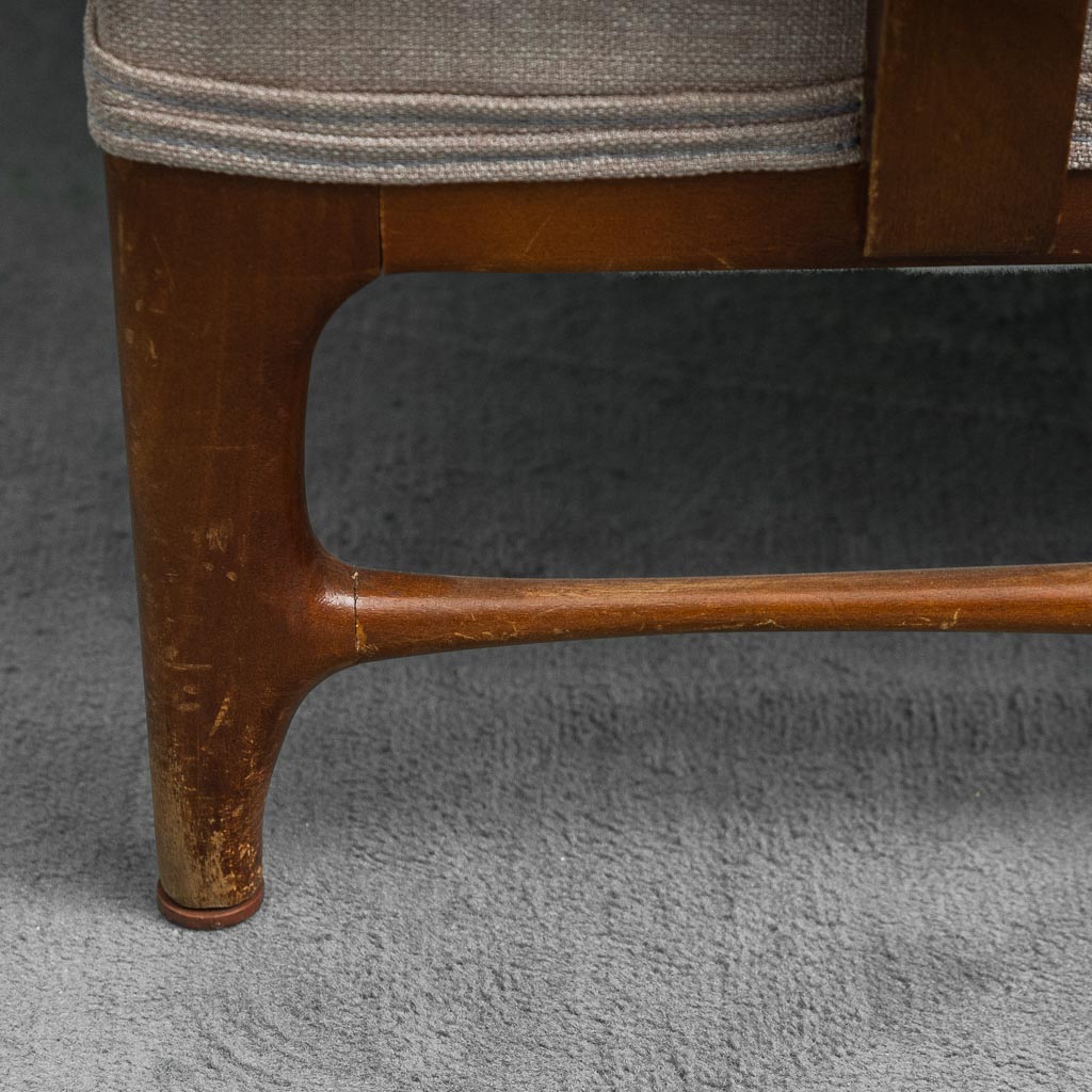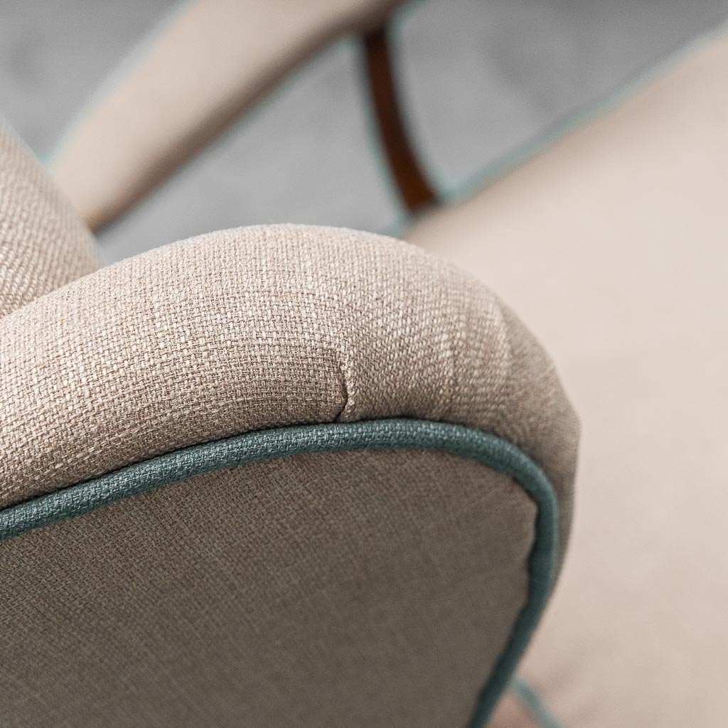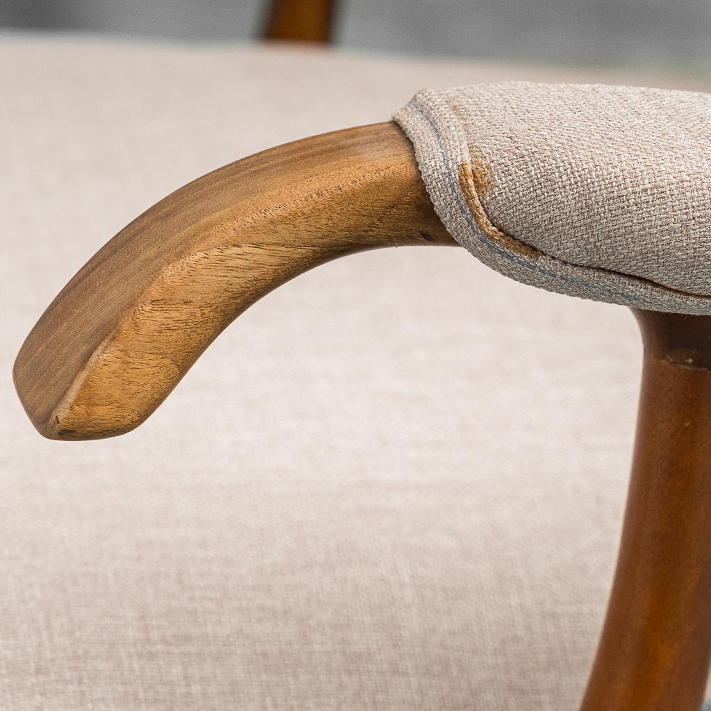 Il rivestimento in tessuto chiaro conferisce alla poltrona un aspetto sobrio e luminoso, mentre il profilo in contrasto aggiunge un dettaglio sartoriale tipico delle produzioni di alta qualità dell’epoca. I braccioli curvati in legno, modellati con grande attenzione ergonomica, richiamano il gusto elegante e discreto riconducibile a Buffa.