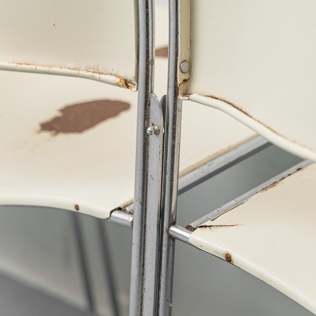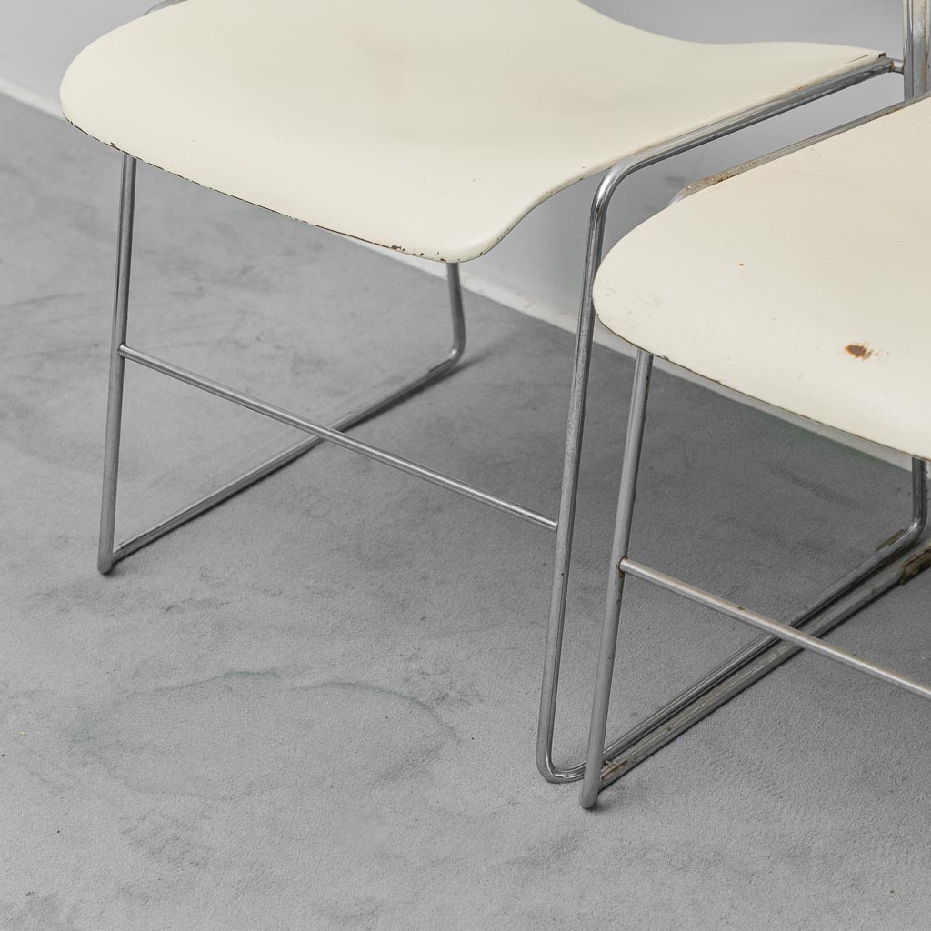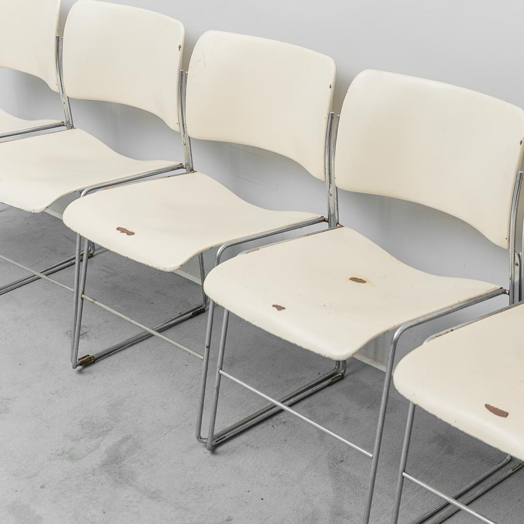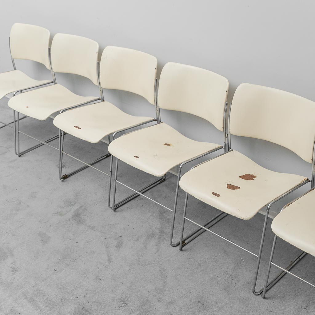 Set composto da 6 sedie modello 40/4, iconico progetto di David Rowland per GF Furniture, datato anni ’60. Caratterizzate da struttura in metallo cromato e seduta in plastica bianca, sono celebri per il design essenziale e la funzionalità impilabile salvaspazio. Perfette per sala da pranzo, ufficio o ambienti contract in stile modernariato e Mid-Century.