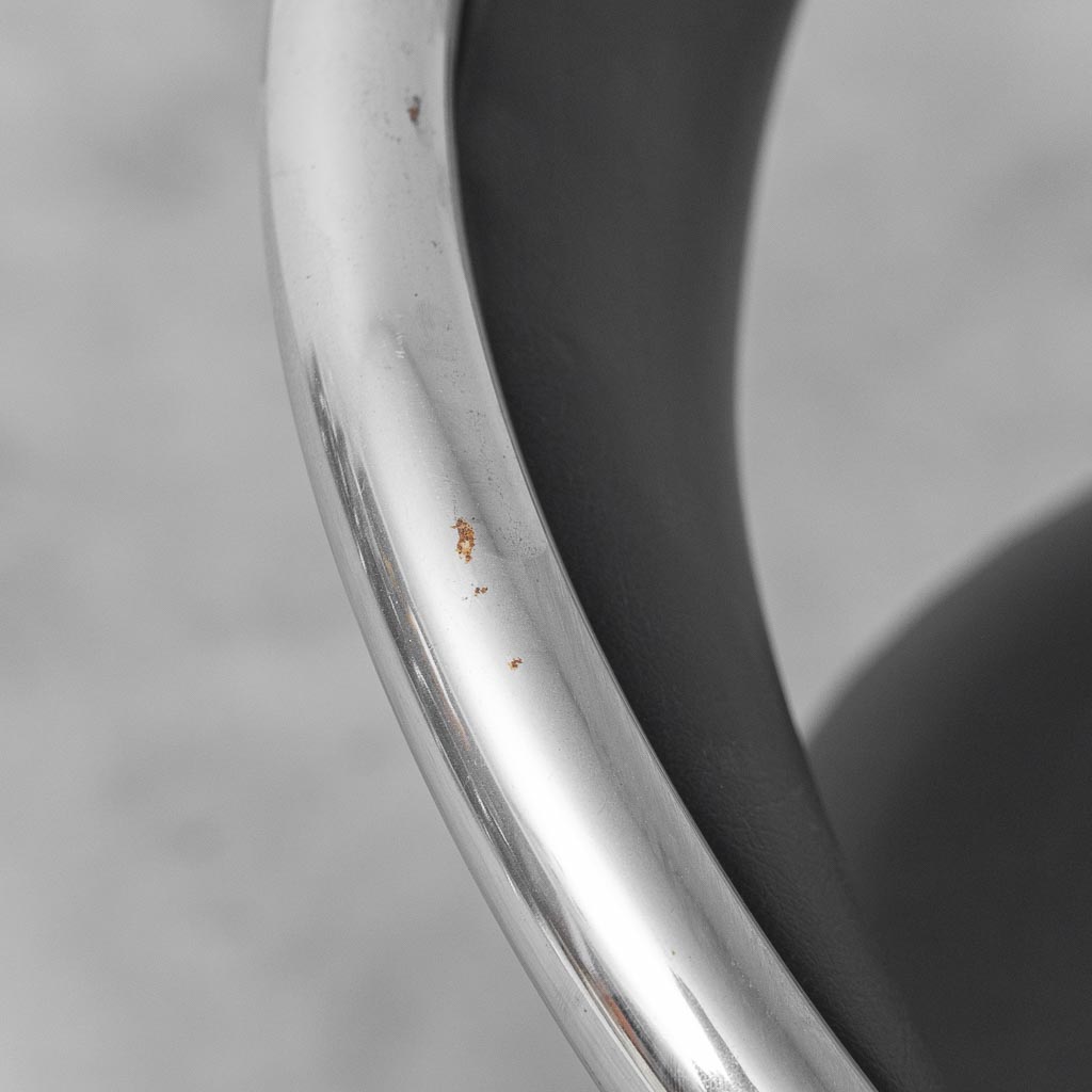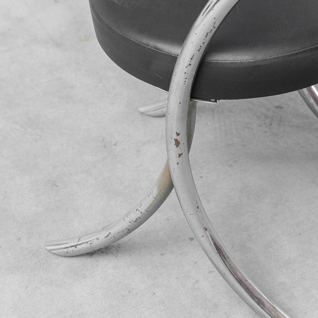 Elegante set di 6 sedie vintage anni ’70 in stile Giotto Stoppino, caratterizzate da una distintiva struttura tubolare in metallo cromato e seduta con schienale rivestiti in ecopelle nera. Linee fluide e design iconico rendono queste sedie ideali per sala da pranzo, ufficio o ambienti modernariato e industrial.