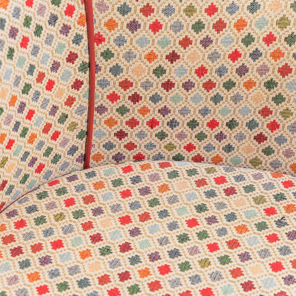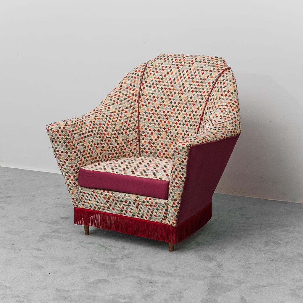 Struttura: Telaio solido in legno, imbottitura originale anni ’50, rivestimento in tessuto gobelin geometrico e velluto rosso; frangia decorativa alla base; piedini in legno.