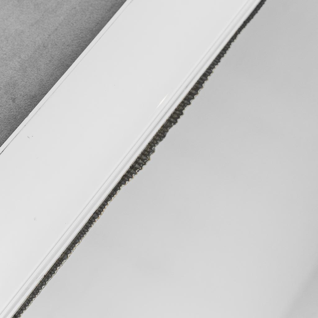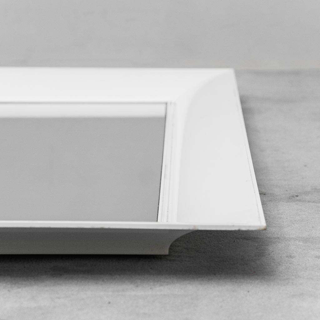 Elegante specchio da parete anni ’90 caratterizzato da una cornice ampia in finitura bianco laccato, dal design essenziale e pulito.
